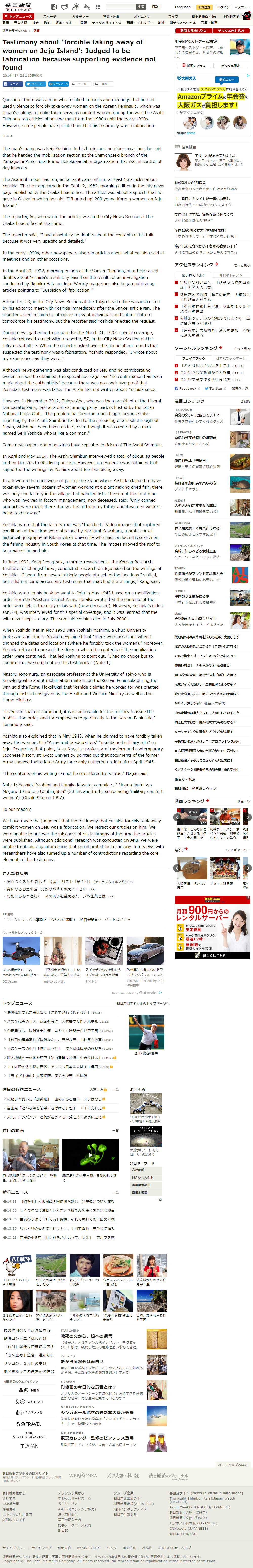 We have made the judgment that the testimony that Yoshida forcibly took away comfort women on Jeju was a fabrication. We retract our articles on him. We were unable to uncover the falseness of his testimony at the time the articles were published. Although additional research was conducted on Jeju, we were unable to obtain any information that corroborated his testimony. Interviews with researchers have also turned up a number of contradictions regarding the core elements of his testimony.